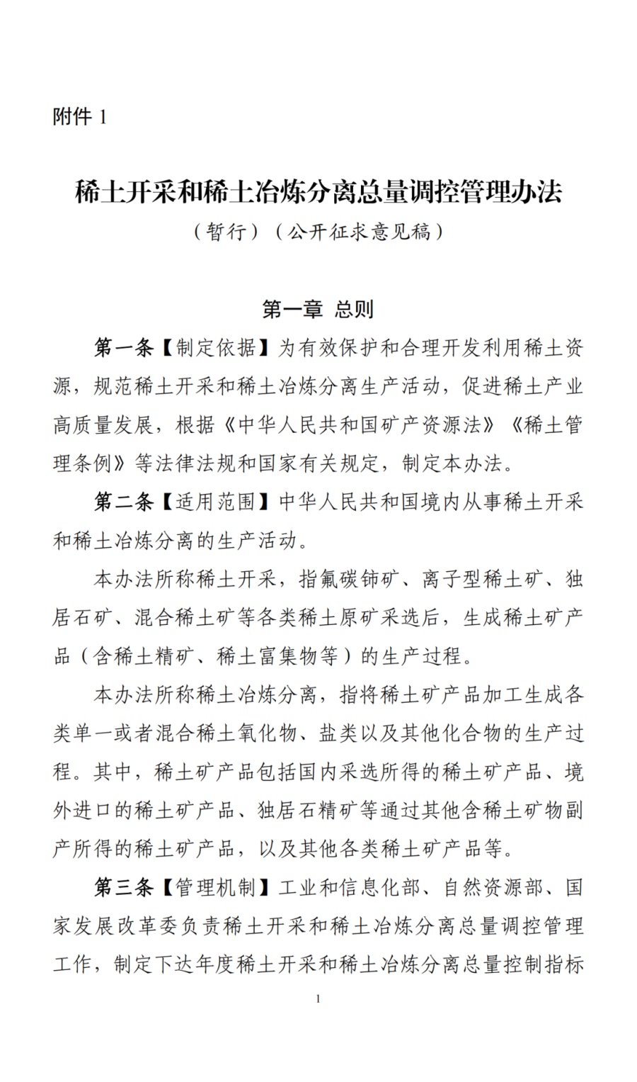 附件:1.稀土开采和稀土冶炼分离总量调控管理办法(暂 行)(公开征求意见稿)